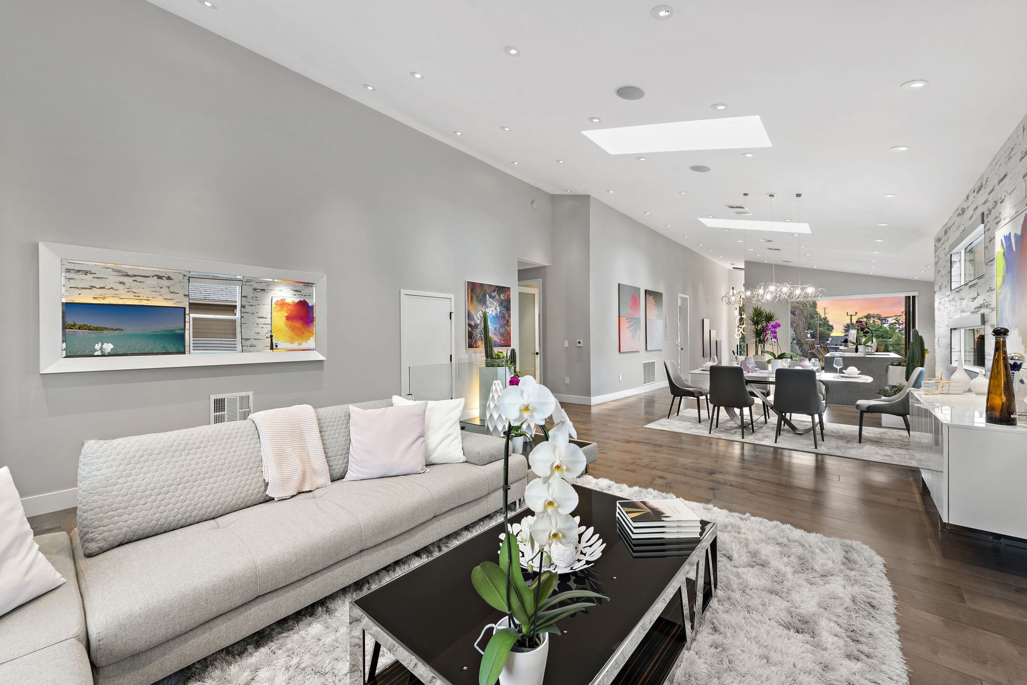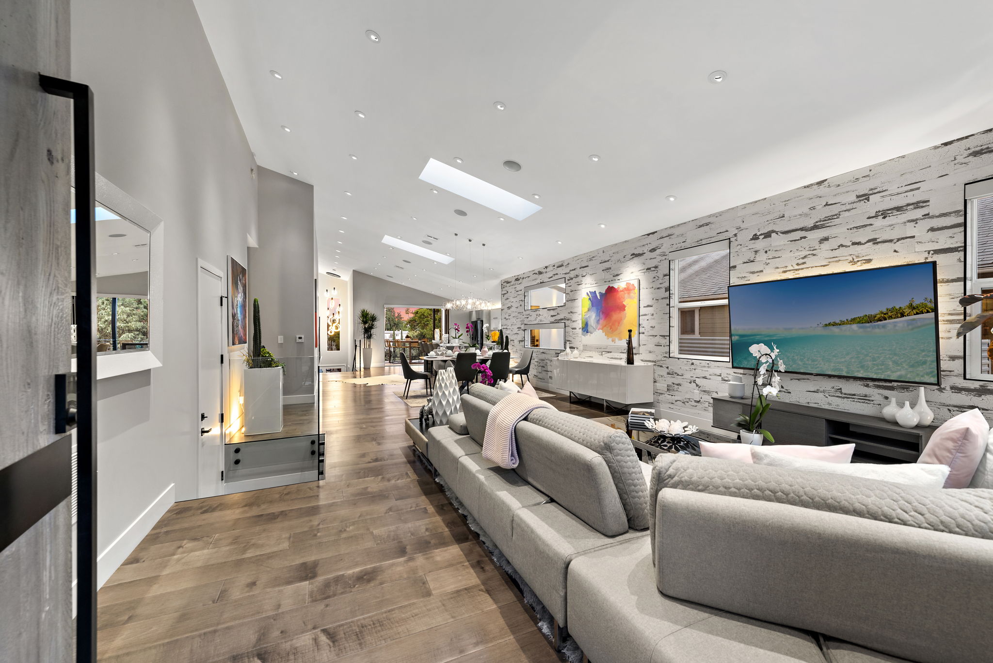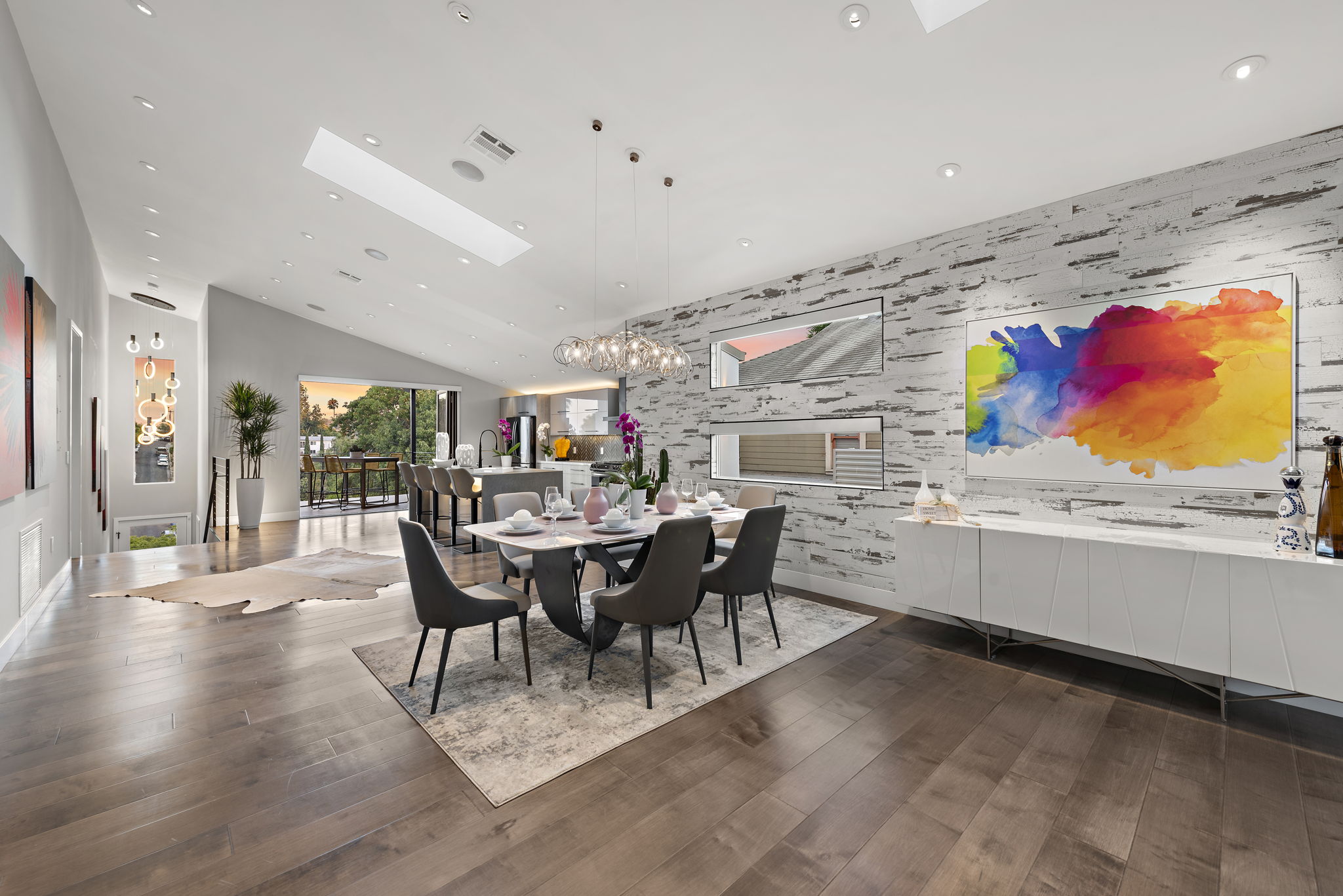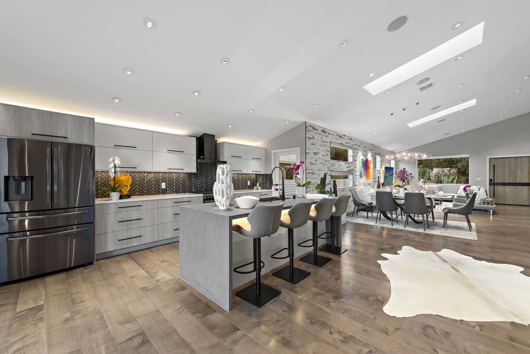 The interior of this home is a delight of design & texture, providing an open feel. Some of the features include; wood flooring throughout, soaring ceilings with skylights and soft LED lighting. Enjoy a waterfall kitchen island complete with stone counter-tops & European soft close cabinetry. An abundance of wall-space is available for your prized paintings & other works of art.