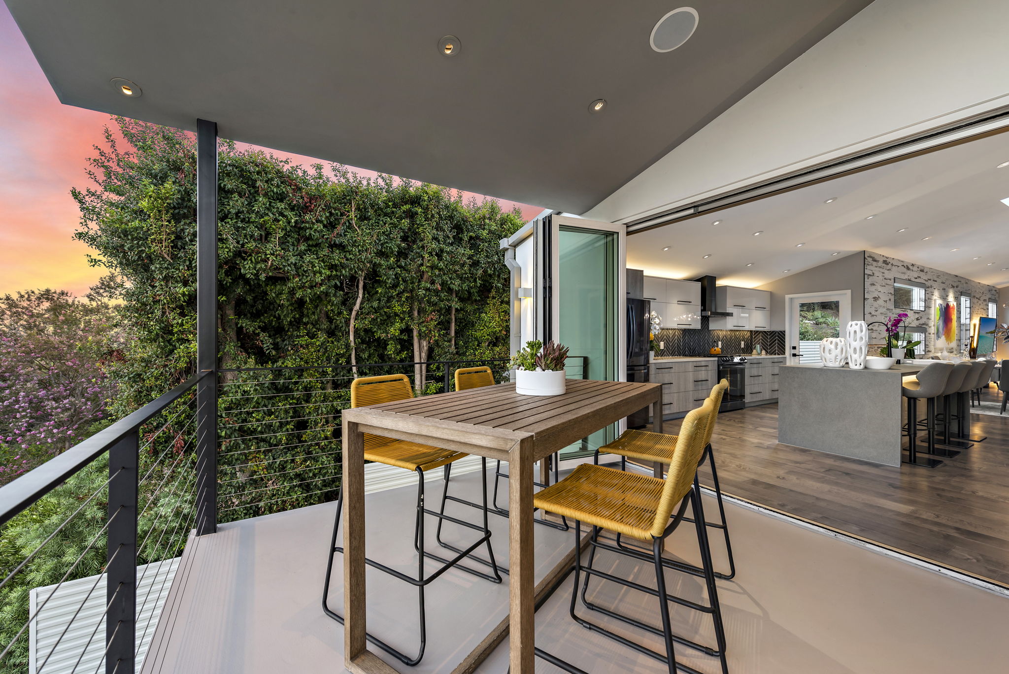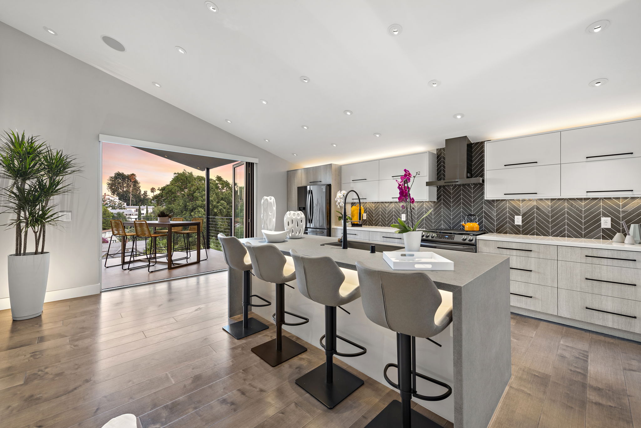 Perfectly sited on a tiered lot with East facing views, this 3-bedroom 3 bath home was taken down to one wall and completely rebuilt into a work of art in perfect harmony with today’s indoor/outdoor lifestyle. Multiple suspended patios bring the outside in at the master bedroom as well as off the kitchen, affording al fresco dining with views of the twinkling lights of the rolling hills & DTLA. This multi-tiered lot provides numerous areas to gather.