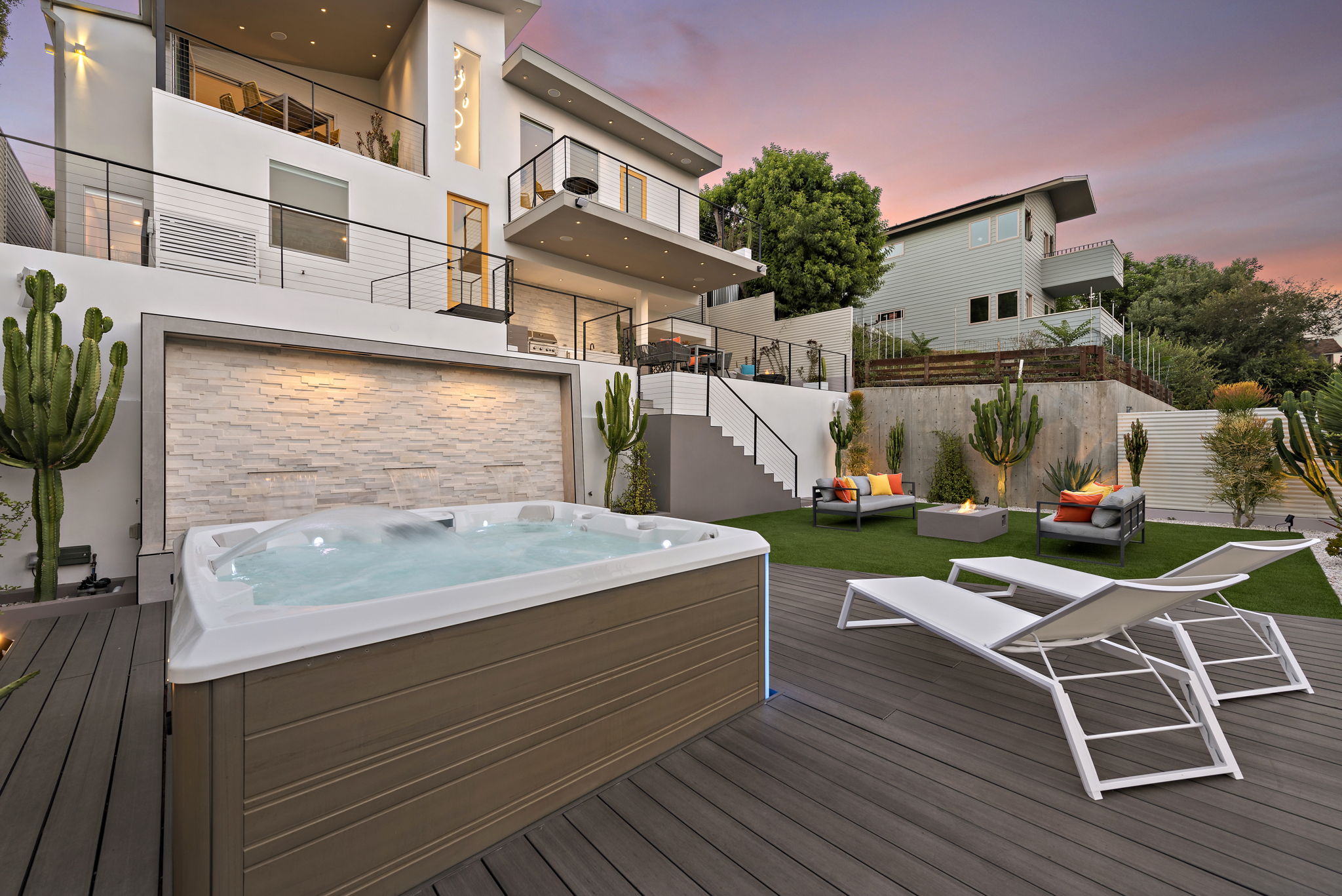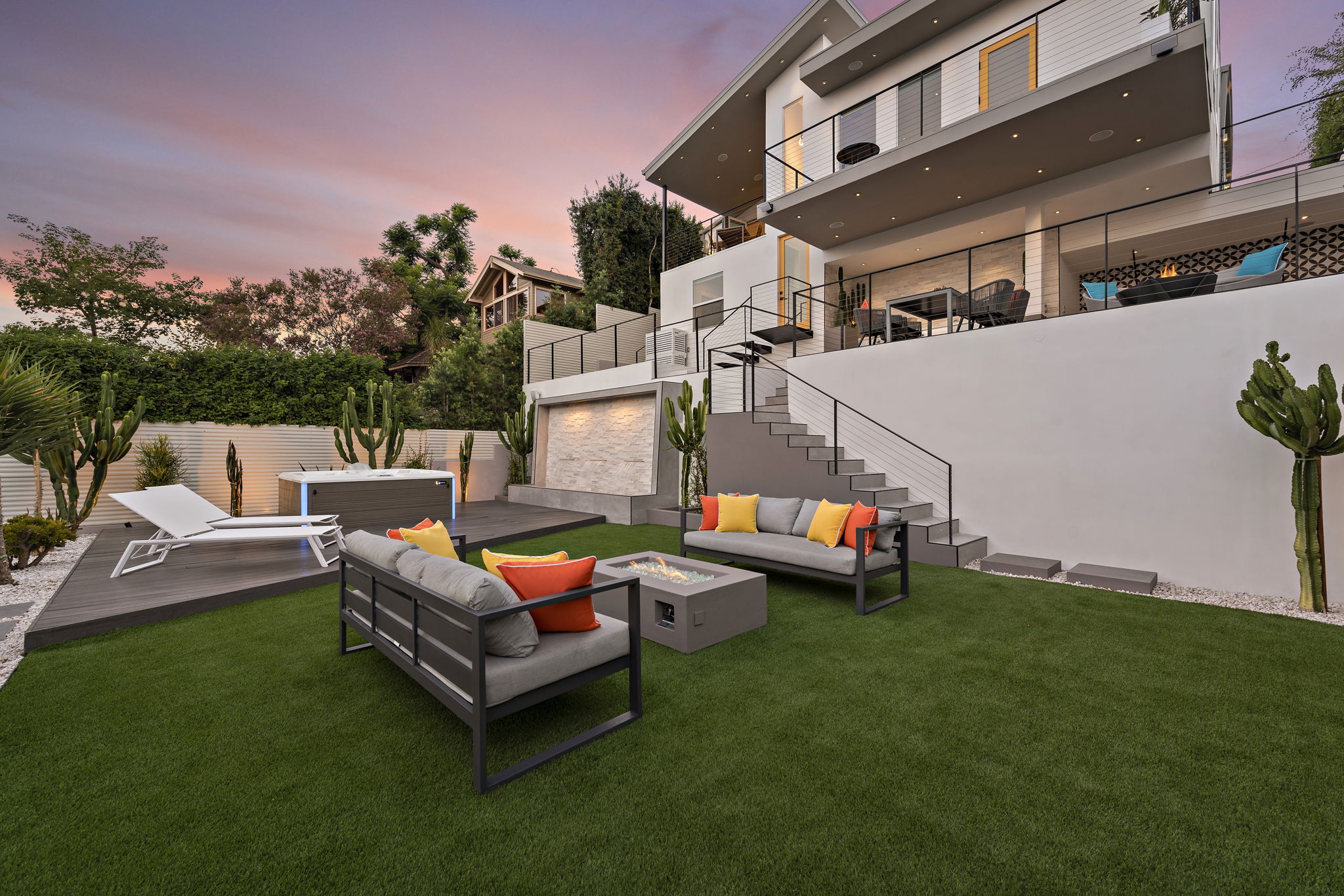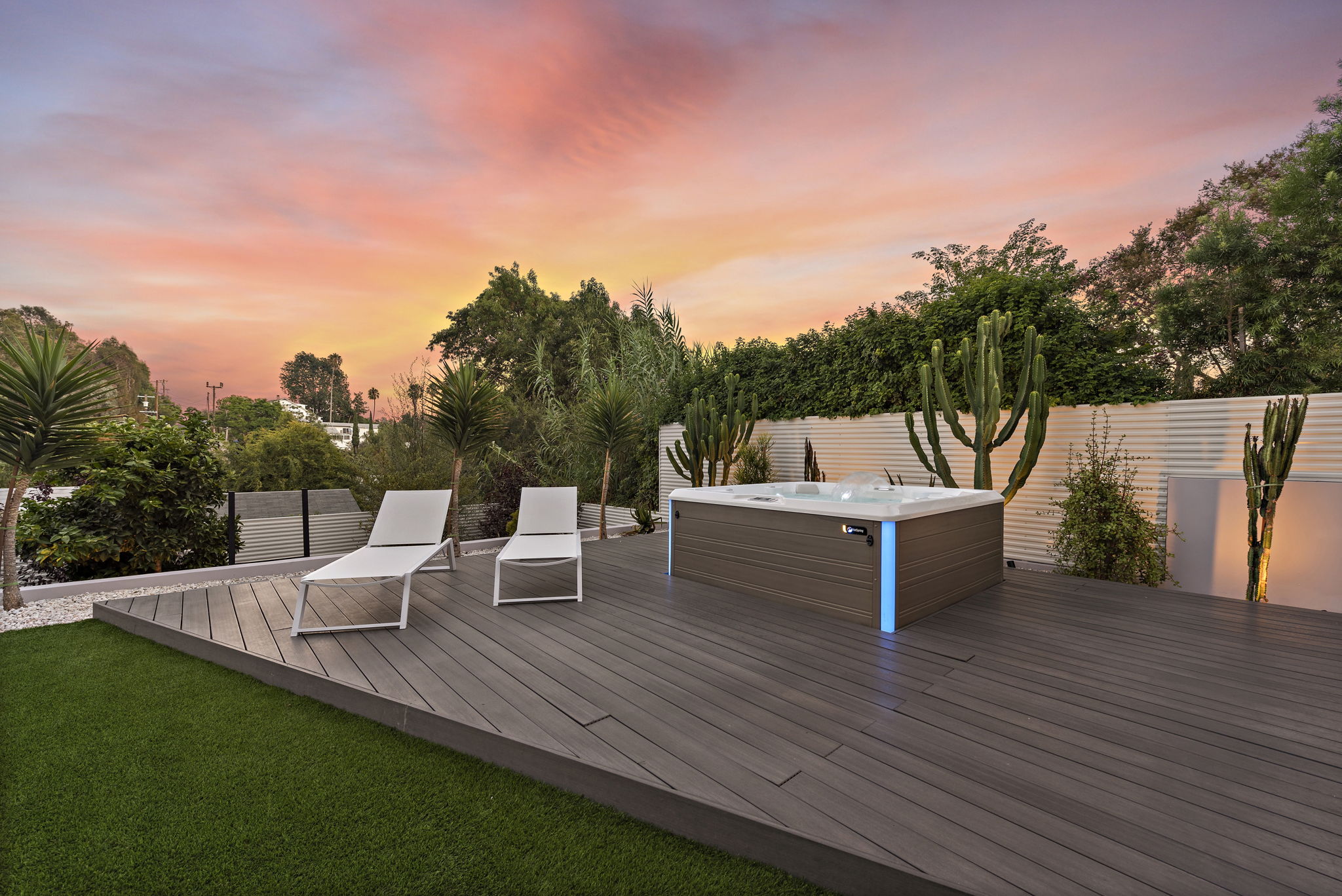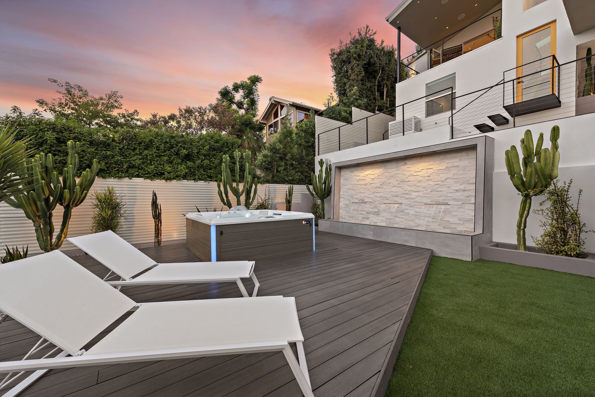 A massive hardscape patio comes complete with an outdoor kitchen, dramatic-tiled lounge areas & room for all of your guests. The 2nd tiered area showcases a custom LED lighted stone quartz waterfall feature as the backdrop to your new Spa and decking, accented with an ease-of-use synthetic lawn. Fruit trees & succulents complete the last 2 tiers, along with room for your own garden, providing shade & additional privacy for years to come.
