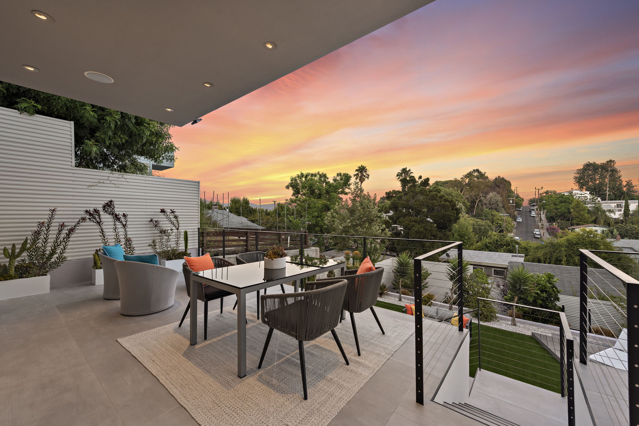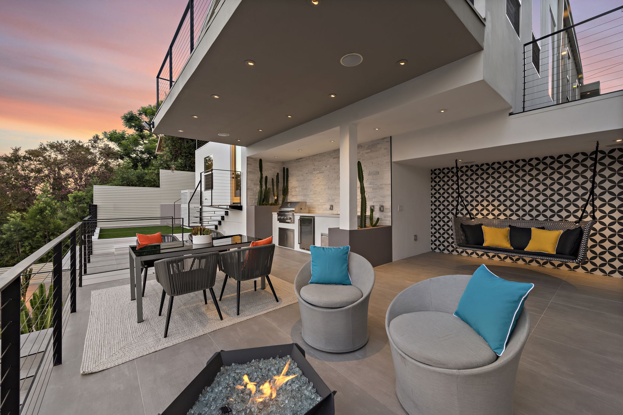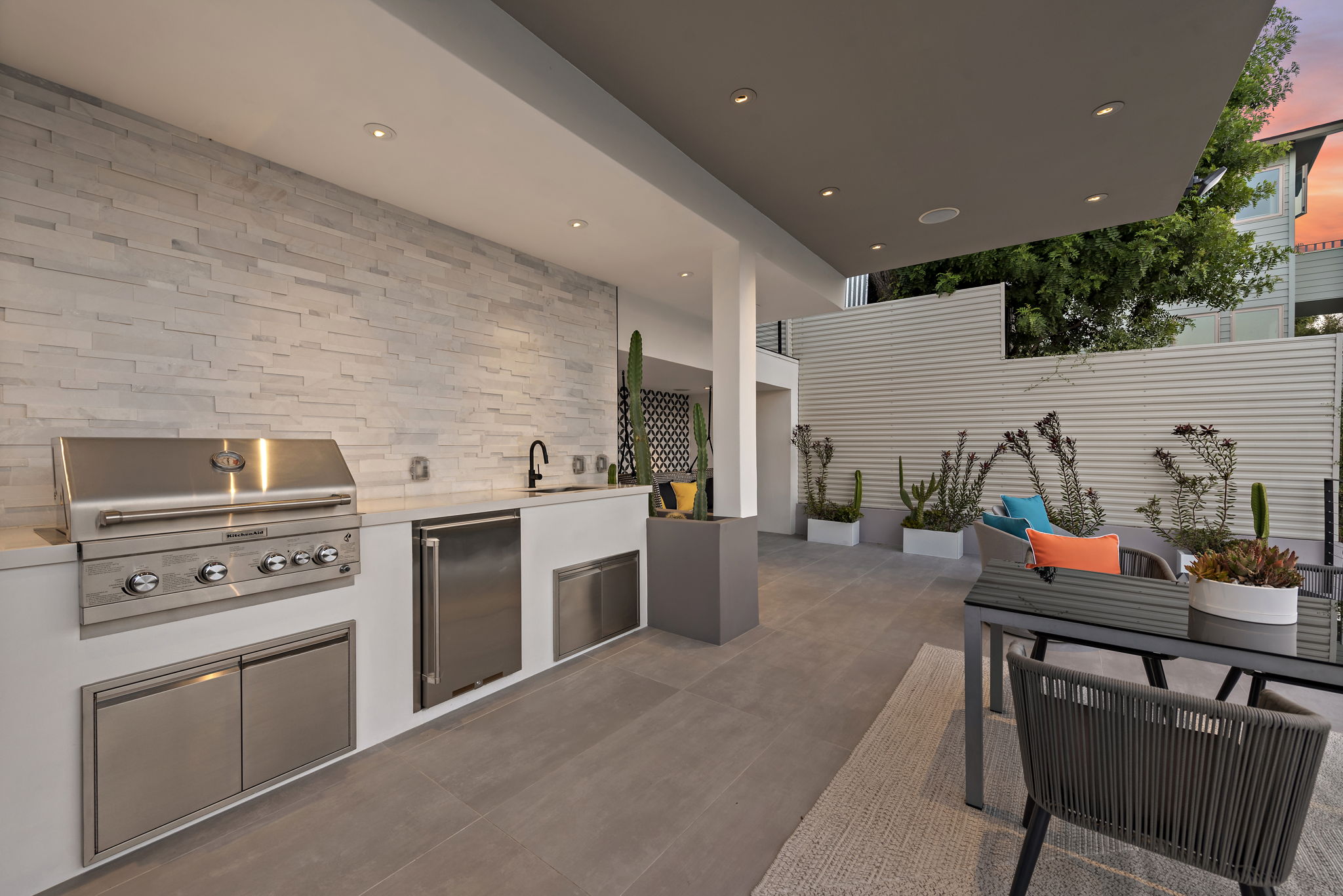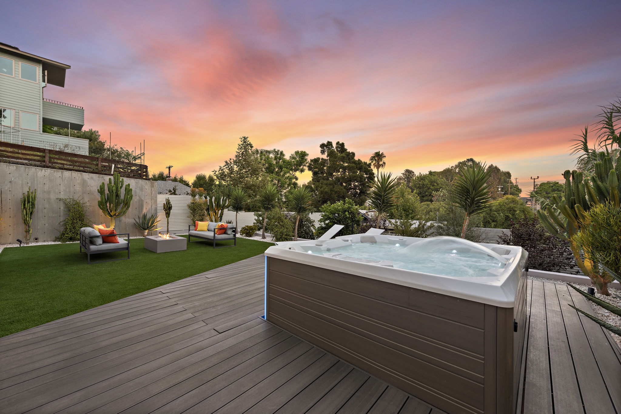 A massive hardscape patio comes complete with an outdoor kitchen, dramatic-tiled lounge areas & room for all of your guests. The 2nd tiered area showcases a custom LED lighted stone quartz waterfall feature as the backdrop to your new Spa and decking, accented with an ease-of-use synthetic lawn. Fruit trees & succulents complete the last 2 tiers, along with room for your own garden, providing shade & additional privacy for years to come.